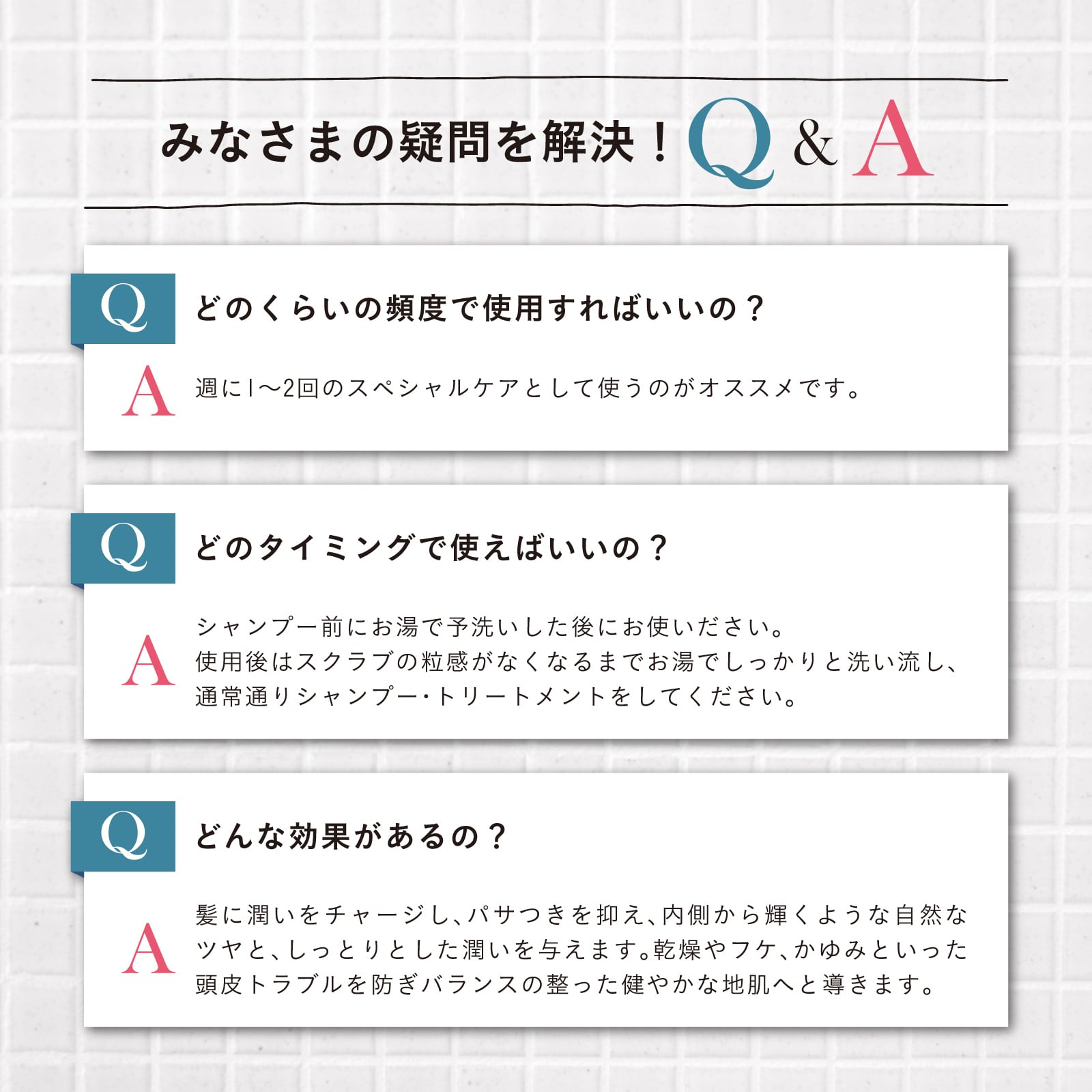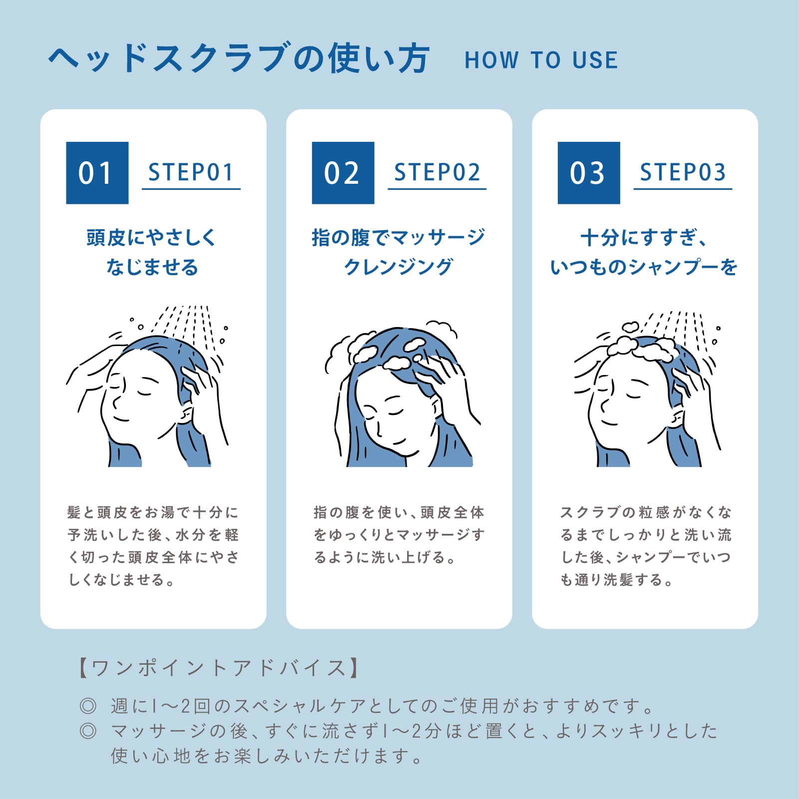 使用方法:髪と頭皮を予洗い後、頭皮に適量をなじませマッサージ。